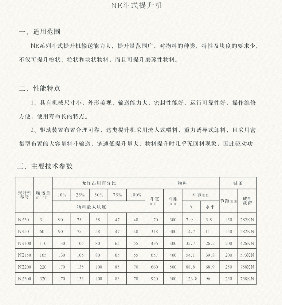 1、提升范圍廣。這類提升機(jī)對(duì)物料的種類、特性及塊度的要求少。不僅可提升粉狀、粒狀和塊狀物料,而且可提升磨琢性物料。要求物料溫度≤250℃。