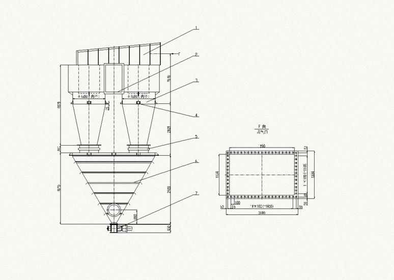 1、出風(fēng)管道 2、法蘭 3、旋風(fēng)筒 4、支座 5、膨脹節(jié) 6、灰斗 7、φ300星型下料機(jī)